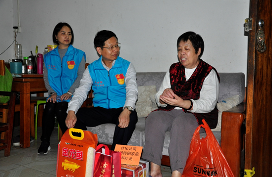 甘化黨員守初心,關(guān)愛活動(dòng)暖人心1月10日下午,公司黨委書記方小潮在甘化社區(qū)黨委人員陪同下,開展關(guān)愛轄區(qū)困難黨員、困難群眾“送溫暖”主題黨日活動(dòng)。方書記一行上門走訪慰問了4戶原甘化困難黨員、1戶困難群眾,詳細(xì)了解他們家庭人員身體狀況和生活狀況,致以誠(chéng)摯的節(jié)日問候,勉勵(lì)他們?cè)鰪?qiáng)信心,早日戰(zhàn)勝困難,并每戶送上了500元慰問金和大米、食油和餅干等節(jié)日禮品。他們都很感動(dòng),連聲道謝;有的還熱淚盈眶,激動(dòng)地說,“您們真好!”通過活動(dòng),讓煎熬中的困難家庭感受到來自于企業(yè)和社會(huì)的關(guān)愛。